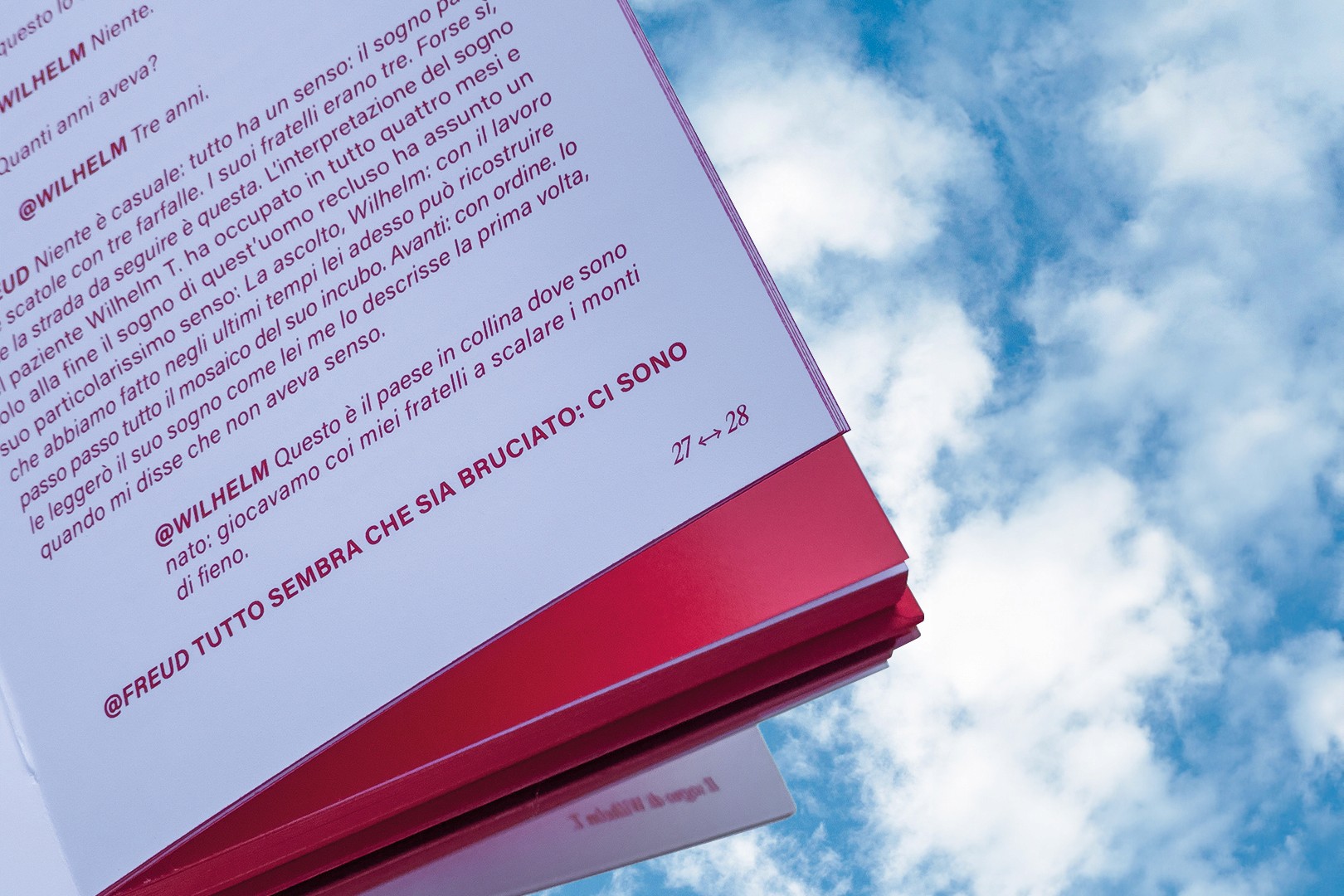 🇬🇧 The book is entirely made in red, a tribute to the scarf that Federico Fellini habitually wore. The text in question is "The Interpretation of Dreams" by Freud, closely tied to the dreamlike themes explored by Fellini in his films. The structure of the book includes 20 acts, and at the end of each chapter, photographs from a related film are inserted, appropriately highlighted in the text with underlining.